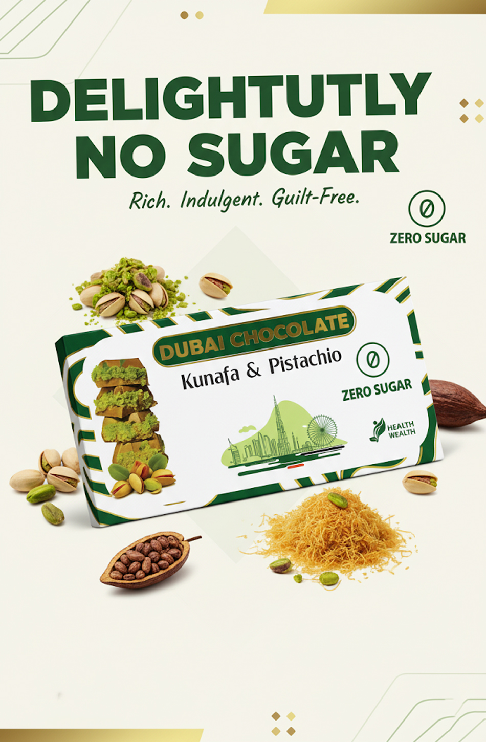 Indulge in guilt-free luxury with Dubai Chocolate Health Wealth Pistachio & Kunafa (220g – Sugar Free). Crafted with premium roasted pistachios and delicate strands of golden kunafa, this exquisite chocolate delivers a rich Middle Eastern flavor with a modern healthy twist.